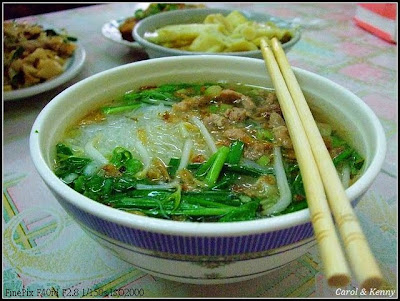 卡羅愛的客家鹹湯圓的湯頭,米粉不是新竹米粉,是有點彈性的.也很好吃.