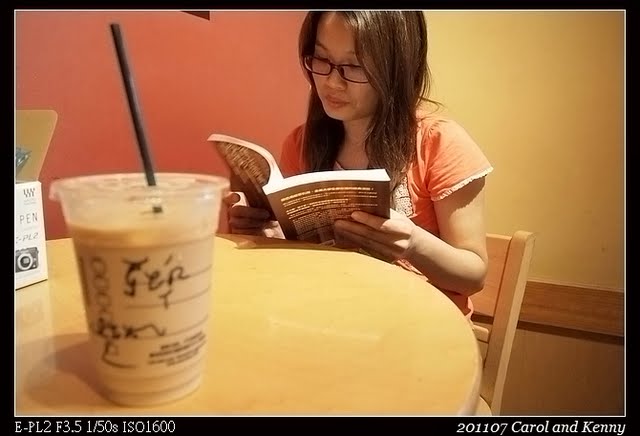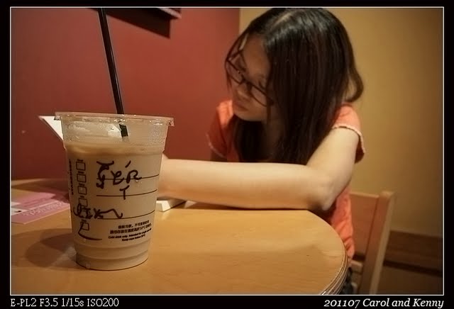 忍不住就打開來試拍..景深的效果很容易展現..前方咖啡模糊,後方人清晰….