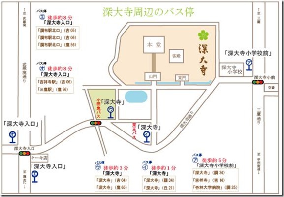 1.從「三鷹駅」「吉祥寺駅」南口,搭京王或小田急巴士《調布駅北口行》,在 「深大寺入口」或「深大寺小学校」公車站下車 徒歩5分